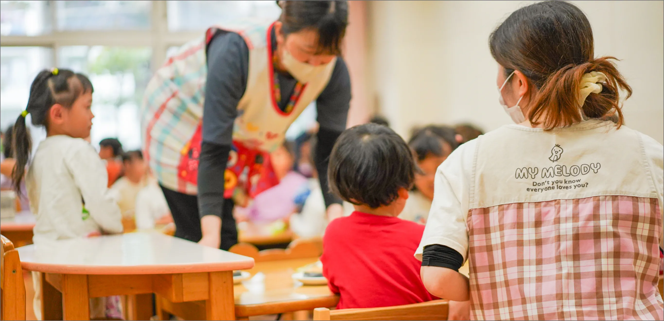 3.4.5歳は11時半〜12時半の間で、子どもたちが自分でランチルームに行く時間を決めています。